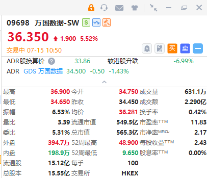万国数据-SW(09698)再涨超5%,截至发稿,涨5.52%,报36.35港元,成交额2.29亿港元。