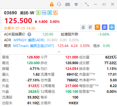 美团-W(03690)午后涨超3%,截至发稿,涨3.8%,报125.5港元,成交额77.22亿港元。