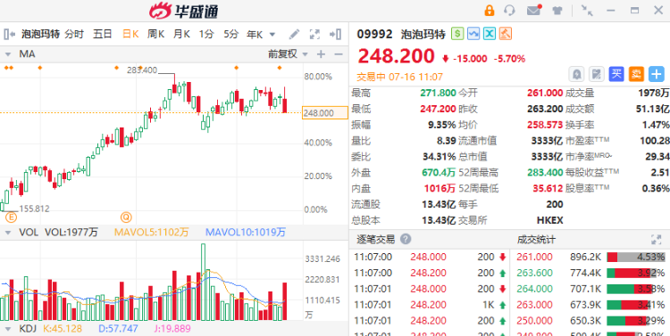 截至7月16日早盘,泡泡玛特股价报248港元/股,跌5%,总市值达3333亿港元,股价较2024年7月15日收盘港元37.36港元/股的价格,已涨超600%。