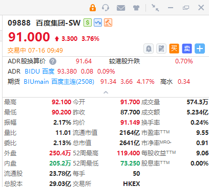 百度集团-SW(09888)现涨近4%,截至发稿,涨3.76%,报91元,成交额5.23亿港元。