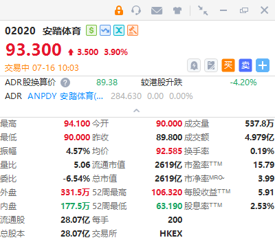 智通财经APP获悉,安踏体育(02020)涨近4%,截至发稿,涨3.9%,报93.3港元,成交额4.979亿港元。