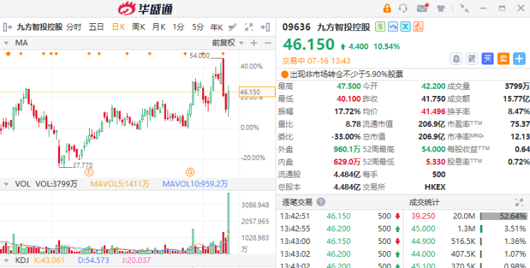 7月16日讯,港股九方智投控股(09636)今日放量大涨10%,当前成交额超15亿港元。