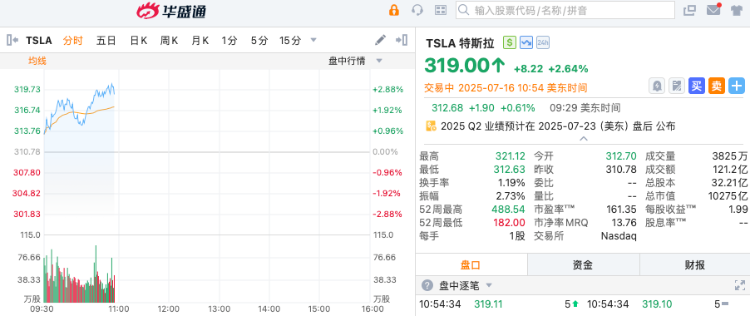 华盛资讯7月16日讯,特斯拉盘中一度拉升涨超3%,现涨2.64%,报319美元。