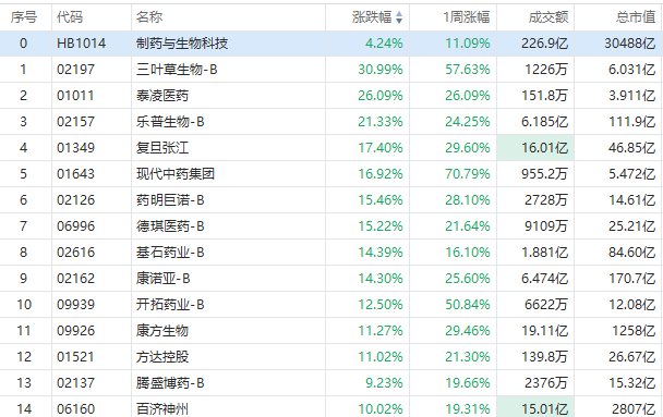 2025年7月17日,港股创新药方向持续大涨,复旦张江、乐普生物-B飙涨20%,百济神州、康方生物、三生制药涨超10%。