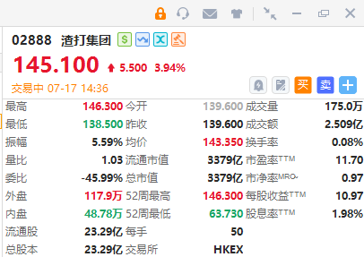 渣打集团(02888)涨近4%,截至发稿,涨3.94%,报145.1港元,成交额2.509亿港元。