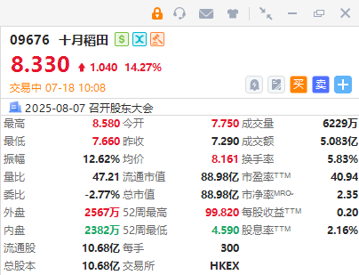 十月稻田(09676)盈喜后涨超14%,截至发稿,涨14.27%,报8.33港元,成交额5.083亿港元。