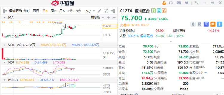 华盛资讯7月18日讯,港股创新药“牛市”继续,歌礼制药-B涨超8%,恒瑞医药涨近6%,荣昌生物、翰森制药、亚盛医药、乐普生物--B均涨近4%,中国生物制药涨2%。