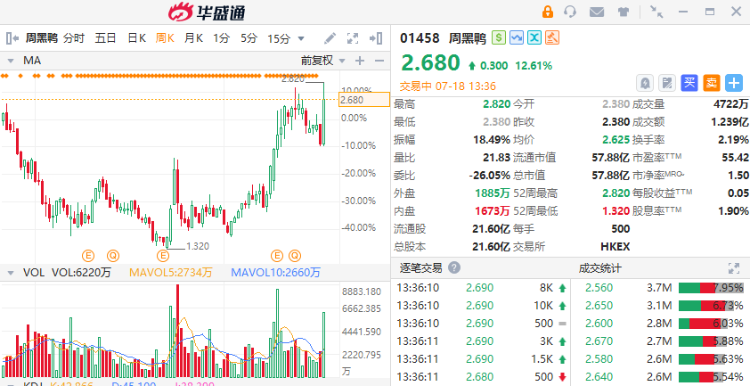 7月18日讯,港股新消费股部分走高,周黑鸭大涨12%, 预计上半年利润同比增长约55.2%至94.8%;锅圈涨超14%,公司预计上半年将录得净利润约1.8亿元至2.1亿元。