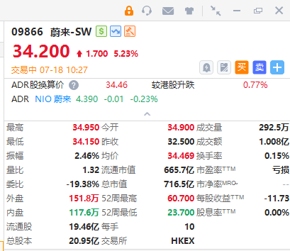 蔚来-SW(09866)再涨超7%,月内累计涨幅已超25%。截至发稿,涨5.23%,报34.2港元,成交额1.008亿港元。