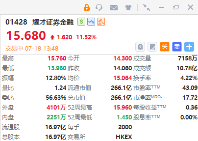 耀才证券金融(01428)再涨近11%,截至发稿,涨11.52%,报15.68港元,成交额10.78亿港元。