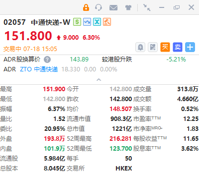 智通财经APP获悉,中通快递-W(02057)涨超6%,截至发稿,涨6.3%,报151.8港元,成交额4.66亿港元。