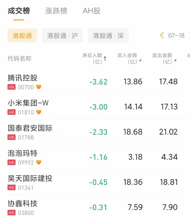 腾讯控股、小米集团-W、国泰君安国际分别遭净卖出3.62亿港元、3亿港元、2.33亿港元。