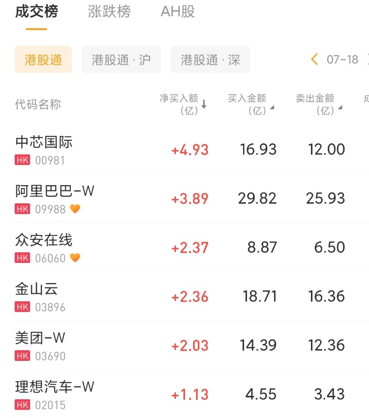 中芯国际、阿里巴巴-W、众安在线分别获净买入4.93亿港元、3.89亿港元、2.37亿港元。