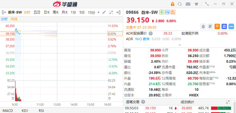 7月23日,蔚来-SW(09866)早盘再度走高,本月股价已累涨超四成。截至发稿,涨8%,报39.15港元,成交额1.79亿港元。