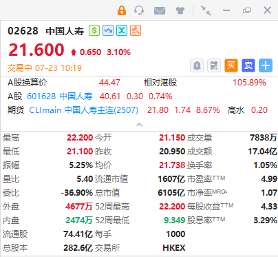 中国人寿(02628)早盘涨超3%,截至发稿,涨3.1%,报21.6港元,成交额17.04亿港元。