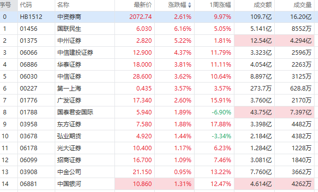 中资券商股盘中普涨,截至发稿,国联民生涨超6%,中州证券涨超5%,中信建投证券涨超4%。