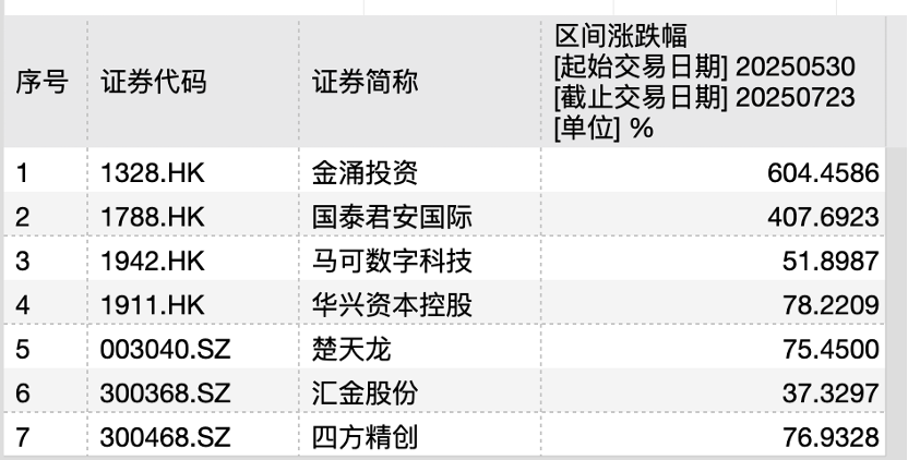 据时代财经不完全统计,公告否认业务涉及稳定币项目的上市公司已超过10家,但其中不少个股均在此期间股价大涨,例如:楚天龙(003040.SZ)、汇金股份(300368.SZ)、四方精创(300468.SZ),在5月30日至7月23日期间,股价涨幅分别高达75.45%、37.33%和76.93%。