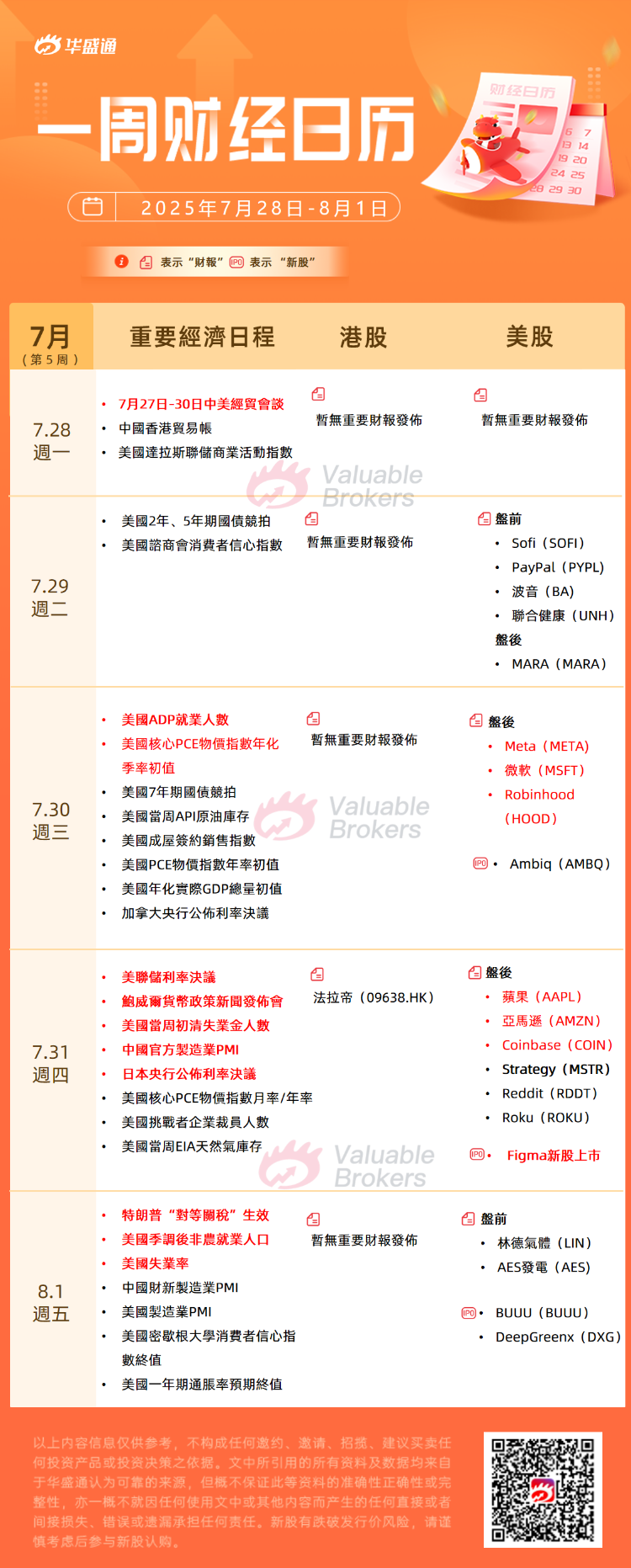 本周受美日贸易协议、《美国AI计划》等利好催化剂下,标普500指数、纳斯达克指数持续冲击历史新高。此外,新一轮财报季也对市场情绪形成助力,谷歌、ServiceNow等公司绩后集体上涨。