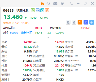华新水泥(06655)午后跌超7%,盘中低见13.42港元,较周一高点20.1港元已跌超30%。截至发稿,跌7.17%,报13.46港元,成交额超6亿港元。