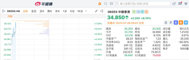 中烟香港 $06055.HK 早盘涨超6%,截至发稿,涨6.74%,报34.85港元,成交额1.21亿港元。
