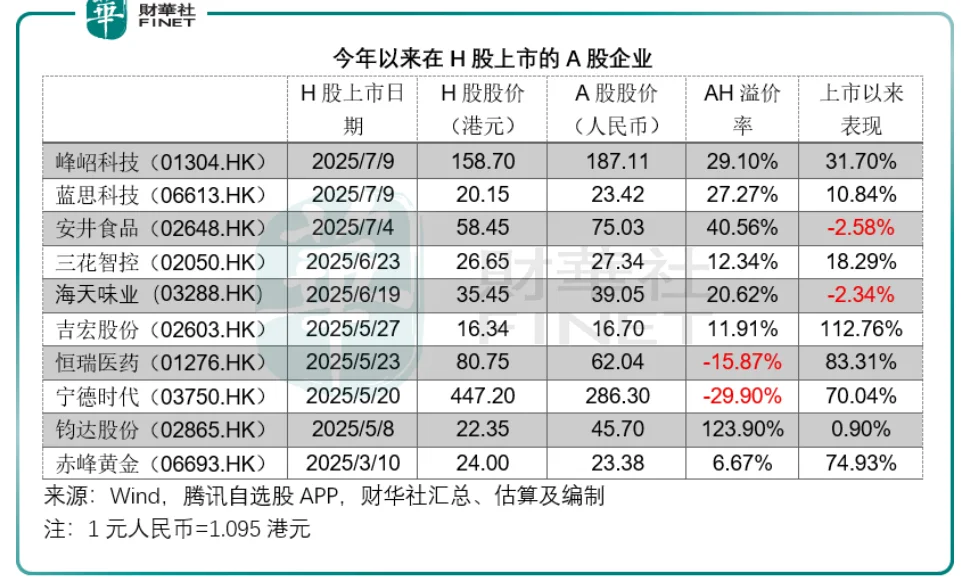 再者,制冷空调零部件供应商三花智控(02050.HK)、调味品龙头海天味业(03288.HK)、电商包装概念股吉宏股份(02603.HK)、光伏电池供应商钧达股份(02865.HK)以及贵金属矿业股赤峰黄金(06693.HK),都相继打通“A+H”双融资平台。