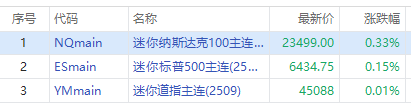 美股周一盘前,三大指数期货盘前齐涨,纳指期货 $NQmain 涨0.33%,标普500期货 $ESmain 涨0.15%,道指期货 $YMmain 涨0.01%。