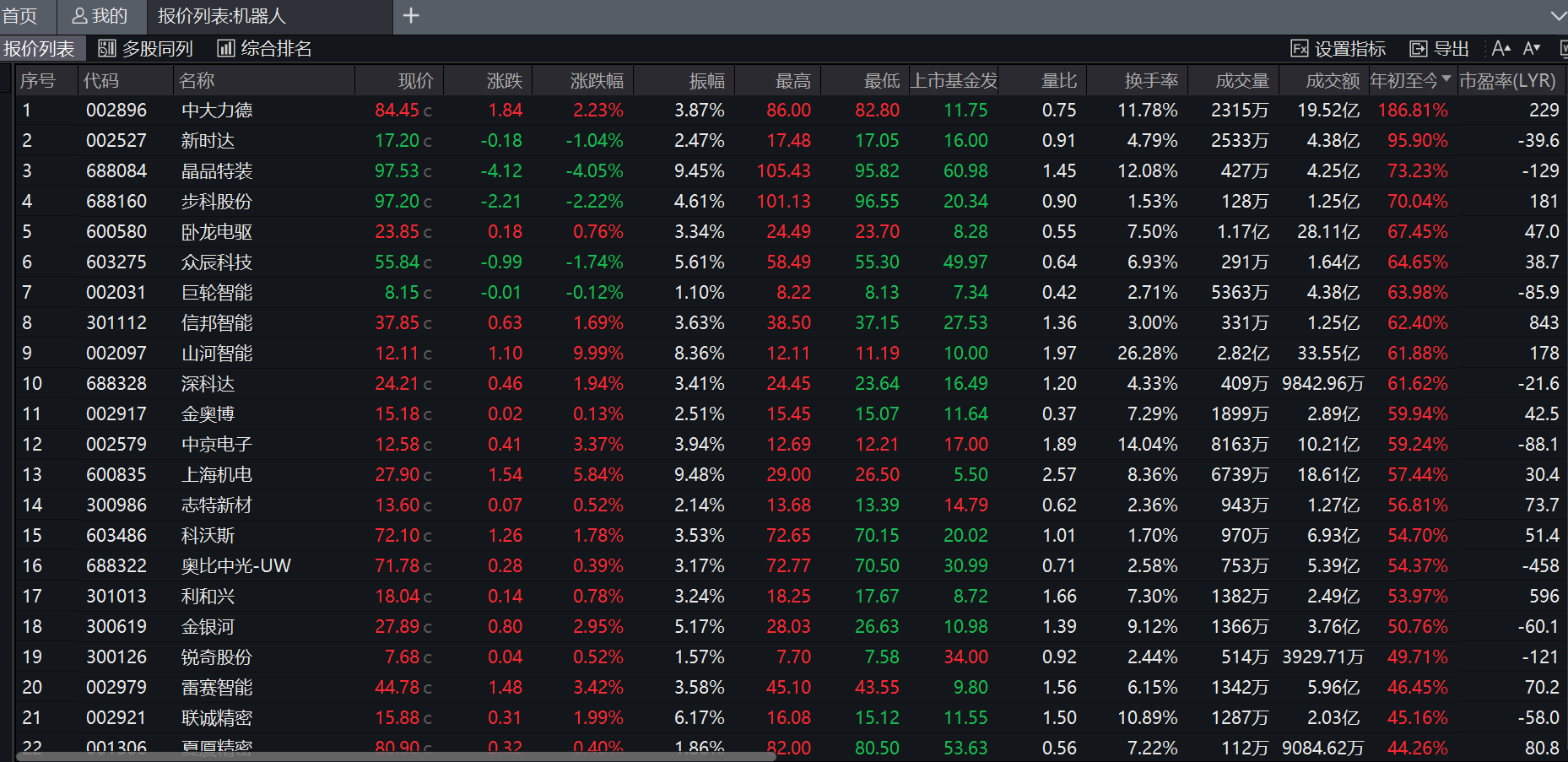 据Wind,截至7月28日,万得机器人指数(884126.WI)今年以来上涨24.05%,超越去年全年10.44%的涨幅。概念股中,中大力德(002896.SZ)、新时达(002527.SZ)、晶品特装(688084.SH)年内涨幅居前,分别上涨186.81%、95.9%、73.23%。