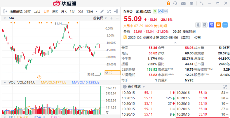 周二,诺和诺德(NVO.US)开盘大跌超20%,创两年半新低,报54.60美元。减肥药板块齐跌,默沙东跌超5%,礼来跌超4%。
