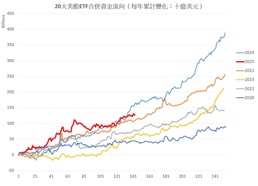 根据市值最大的二十只美股ETF合并资金流向统计,自约4月中以来,虽然指数展现反弹走势,但资金累计流向却自高位回软,并长时间维持横向发展,直至近期美股再创新高时才重拾升势,令累计净流入突破1,000亿美元。截至本周初,该数字约为1,260亿美元,仍较去年同期稍低(见图1)。