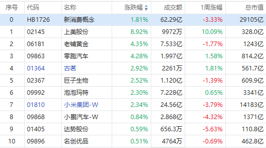 8月4日讯,港股新消费股今日集体反弹,截至发稿,上美股份反弹逾8%,老铺黄金反弹逾4%,泡泡玛特、古茗、小米集团涨逾2%。