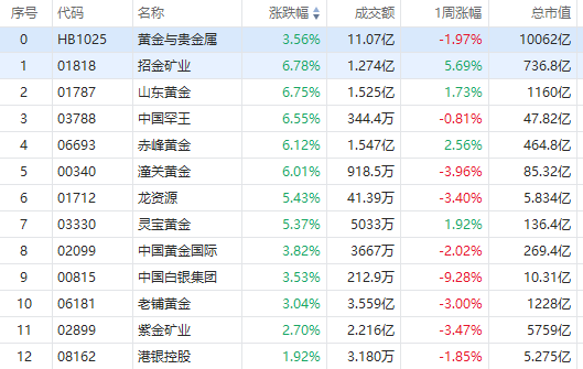 8月4日讯,港股黄金股集体走高,截至发稿,山东黄金、招金矿业、赤峰黄金均涨超6%,中国黄金国际涨超3%。