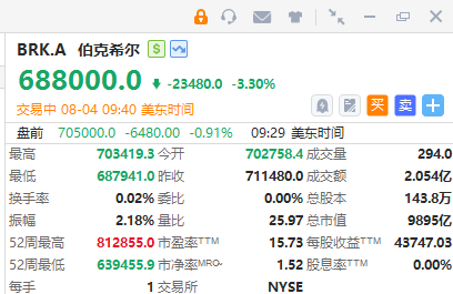 华盛资讯8月4日讯,伯克希尔盘初跌超3%,股价至2月3日以来的最低水平。