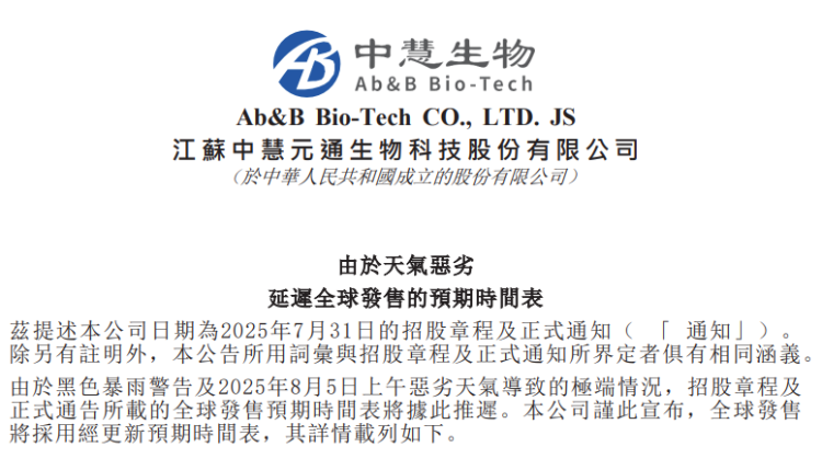 据交易所最新公告指示,因香港黑色雷暴警告信号下,中慧生物-B(02627.HK)上市时间将延后至2025年8月11日,公布中签及暗盘时间顺延至2025年8月8日,而华盛认购截止时间亦会延至2025年8月6日10:00。