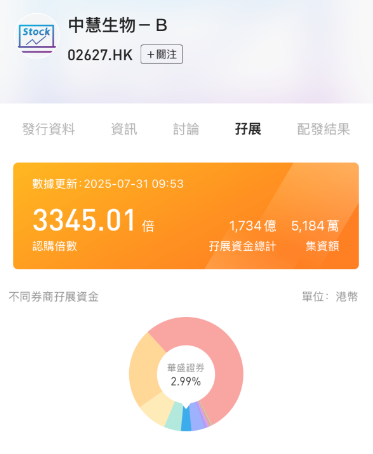 截至发稿,中慧生物-B公开发售孖展认购超3345倍,冻资金额达1734亿港元。