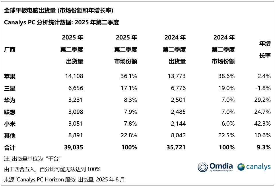 Canalys(现并入Omdia)研究经理Himani Mukka 表示:“在中国消费者补贴政策的支持以及全球商用招标项目的推动下,全球平板市场在第二季度继续展现出强劲的增长势头。市场还受益于一波新品发布热潮,尤其是在游戏平板领域。随着消费者对游戏场景的兴趣日益增长,游戏平板已成为一个细分增长品类,尤其在亚洲地区表现突出。值得关注的新品包括小米的Redmi K Pad(8.8英寸)和vivo的Pad5,联想的Legion Tab季度出货量更是翻倍增长。厂商们也在将平板作为其互联生态战略的关键组成部分。荣耀在第一季度率先发布‘Alpha’计划,小米则于5月推出‘人车家全生态’战略,旨在无缝整合智能手机、平板、智能家居设备,甚至新能源汽车。新发布的小米Pad 7 Ultra正是该生态中的核心控制枢纽。”