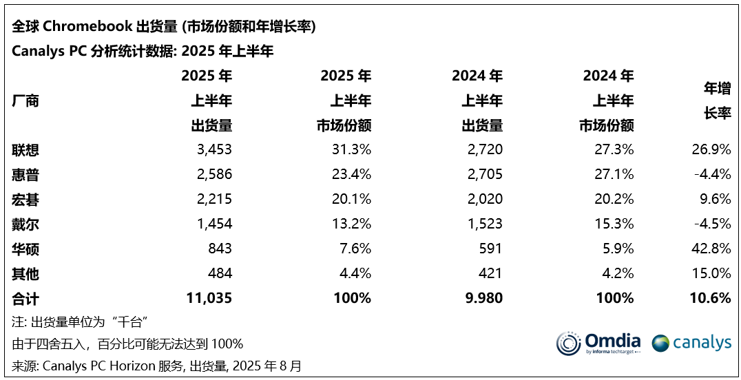 2025年上半年,联想凭借在日本GIGA学校项目中的重要地位,领先全球Chromebook市场,出货量达到350万台,同比增长27%。惠普位列第二,但市场份额被联想抢占,年出货量同比小幅下降4%。作为亚洲市场的重要品牌,宏碁实现了10%的健康增长,出货量达220万台。戴尔排名第四,出货量为150万台,同比下降5%。华硕凭借GIGA项目带动的需求表现强劲,出货量达到80万台,同比增长43%,跻身前五。