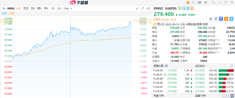 8月6日讯,港股泡泡玛特尾盘持续拉升,股价现涨近9%,成交额48亿港元。