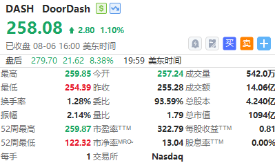 截至发稿,DoorDash盘后股价上涨8.38%至279.7美元,市场对其增长前景给予积极反馈。