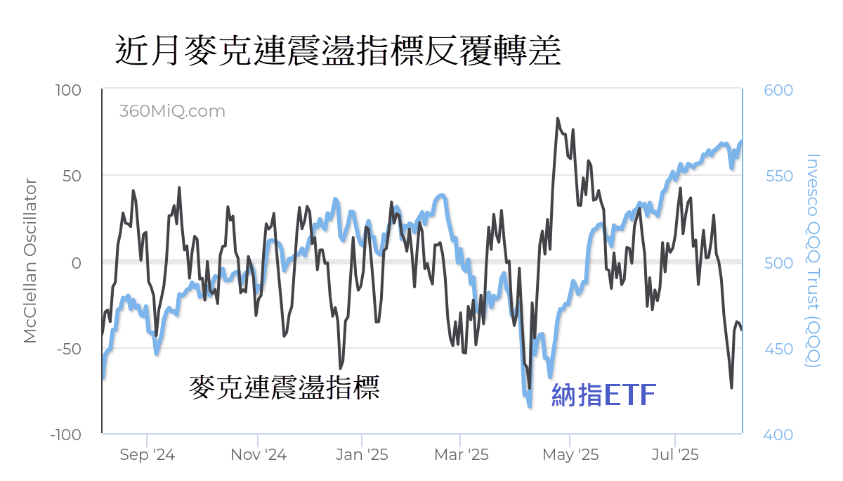 首先,技术面显示市场宽度正在恶化。统计数据指出,自7月下旬起,纳斯达克指数中高于其50天与200天移动平均线的成份股比例出现明显下滑。具体而言,处于50天线之上的股票比例(代表中线市宽)由接近七成高位,急速下跌至46.1%,即不到一个月内下挫超过20个百分点(见图1)。至于长线市宽亦表现疲弱,现时仅约44%的成份股高于200天线,意味过半股票已跌穿其长期均线。换言之,即使纳指不断刷新高位,但升势越来越倚赖少数权重股支撑,市场整体动能正在收缩。