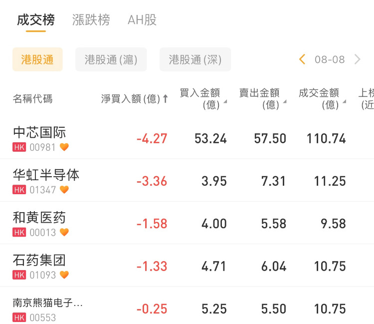 中芯国际、华虹半导体、和黄医药分别遭净卖出4.27亿港元、3.36亿港元、1.58亿港元。