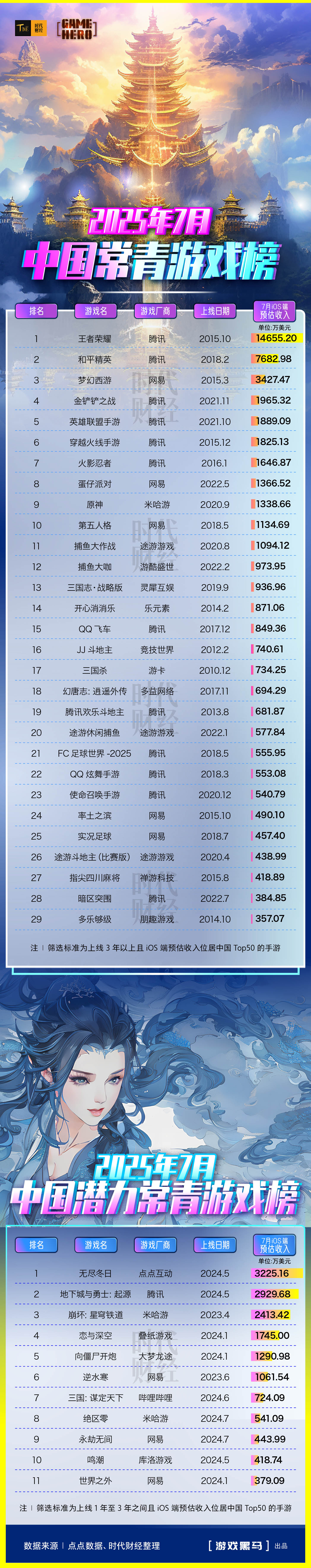时代财经以上线3年以上且iOS端预估收入跻身中国地区Top50为筛选标准,统计并发布《2025年7月中国常青游戏榜》(下称“《常青榜》”);同时以上线1年至3年且iOS端预估收入跻身中国地区Top50为标准,统计并发布《2025年7月中国潜力常青游戏榜》(下称“《潜力常青榜》”)。