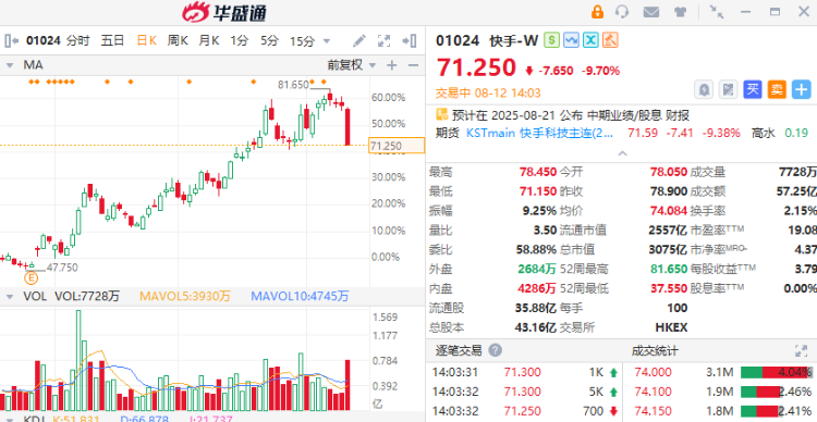 8月12日讯,港股AI应用股盘中集体下跌,快手-W大跌近10%,金蝶国际、美图公司跌近8%。