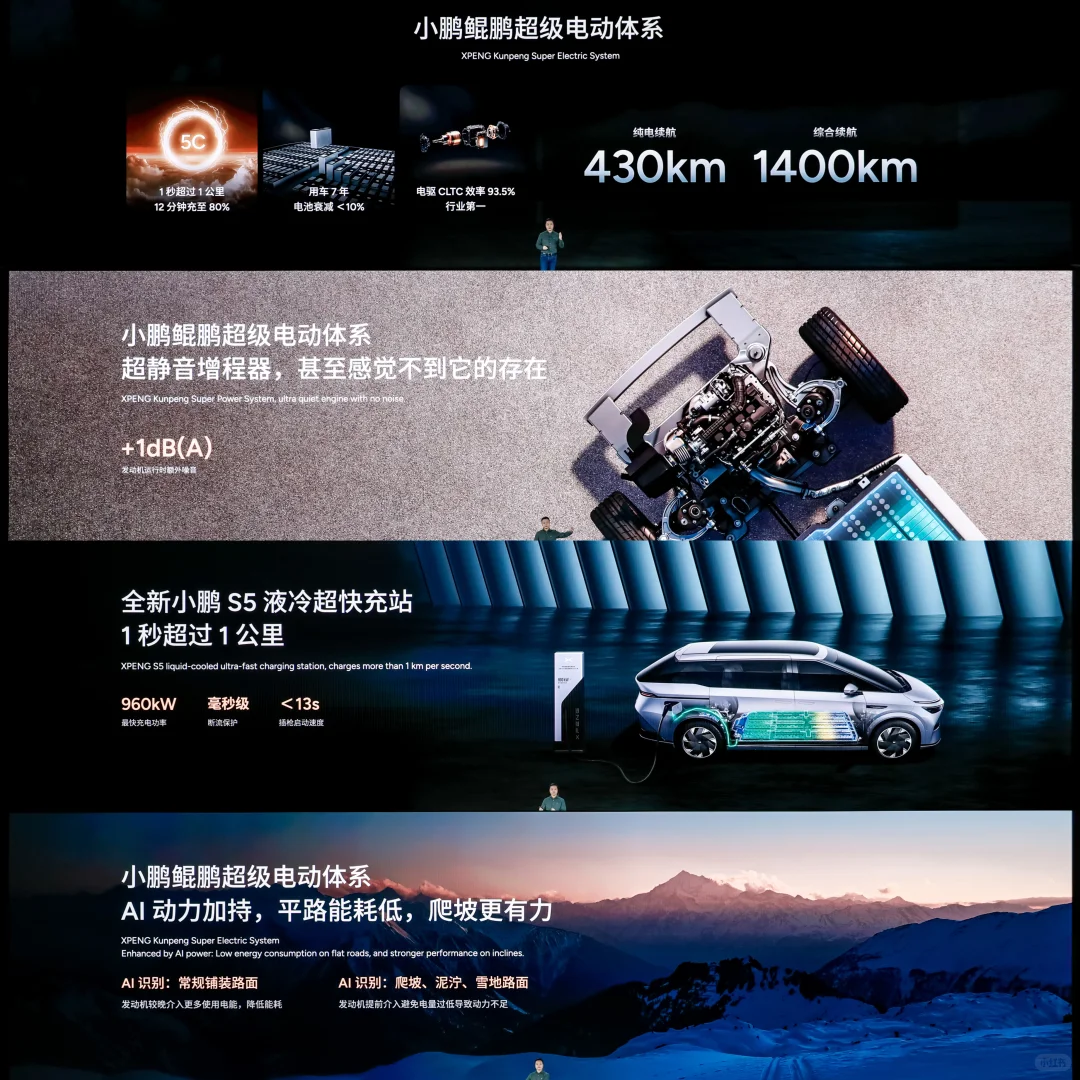 据了解,小鹏汽车于2024 AI科技日上正式发布全新的电动体系——小鹏鲲鹏超级电动体系,标志着小鹏汽车正式吹响进军增程赛道的号角,该体系基于全域800V高压碳化硅平台打造,融合5C超充AI电池、混合碳化硅同轴电驱、静音增程器以及AI电池医生和AI动力等先进技术。其中,“鲲”代表超级增程系统,采用下一代增程技术,“鹏”则继续代表小鹏汽车的纯电体系,展现出小鹏在纯电与增程双技术路线并行发展的决心。