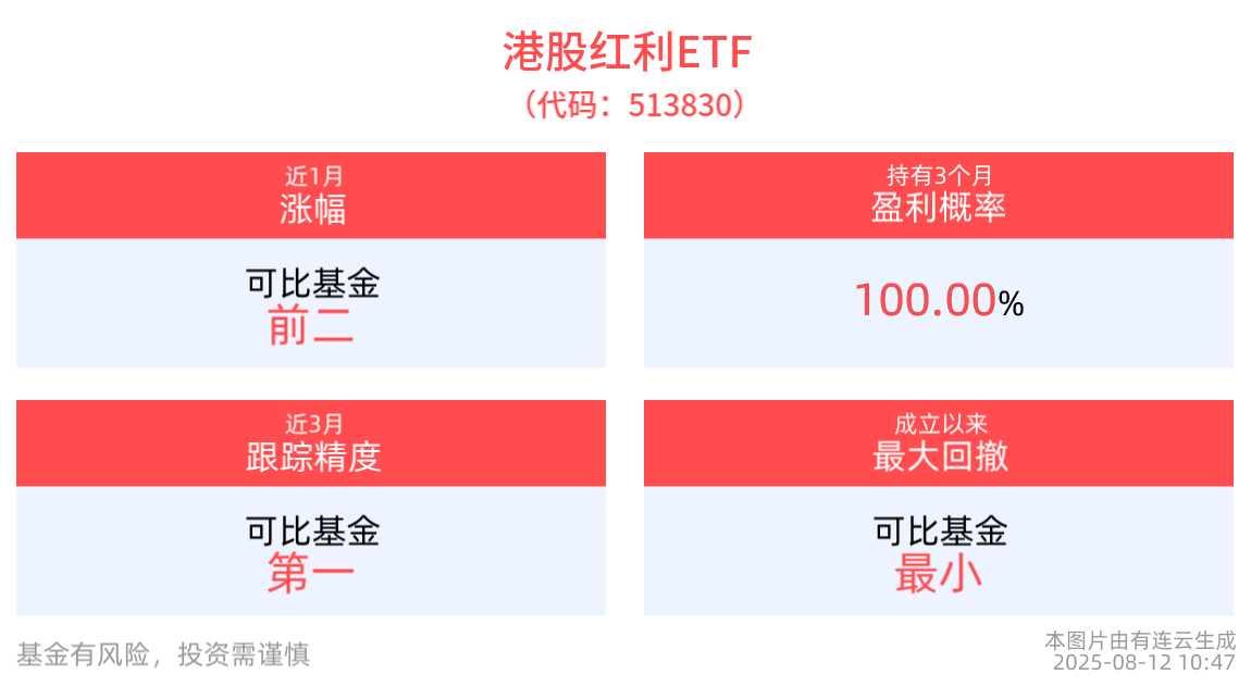 从收益能力看,截至2025年8月11日,港股红利ETF自成立以来,最高单月回报为8.42%,最长连涨月数为3个月,最长连涨涨幅为19.07%,上涨月份平均收益率为4.60%。
