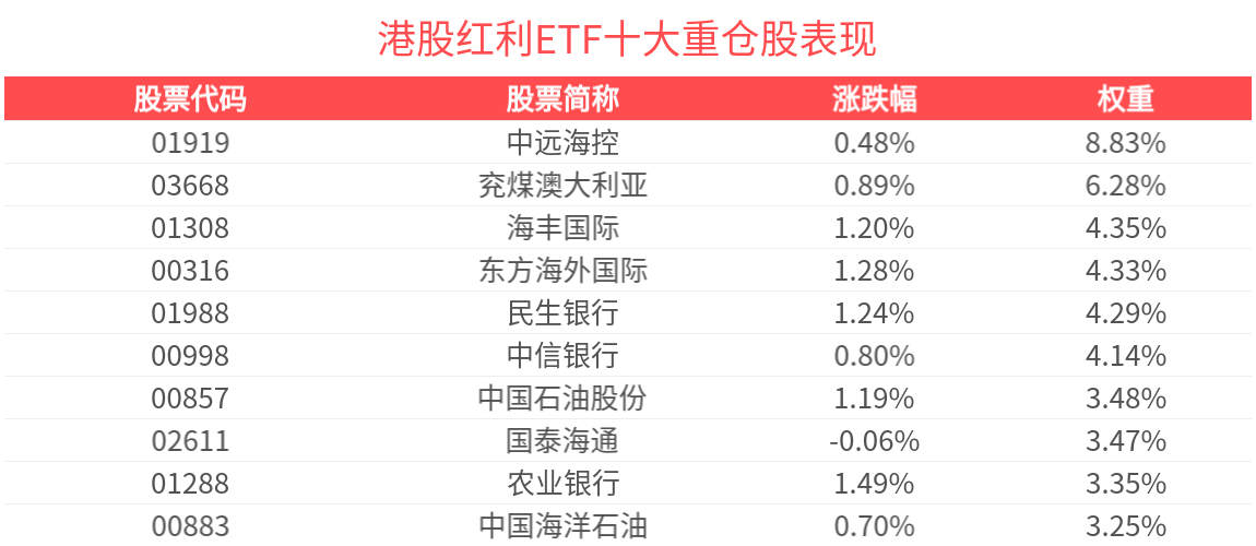 数据显示,截至2025年7月31日,中证港股通高股息投资指数前十大权重股分别为中远海控、兖煤澳大利亚、国泰海通、东方海外国际、民生银行、海丰国际、中信银行、中国石油股份、中国海洋石油、中国神华,前十大权重股合计占比47.67%。