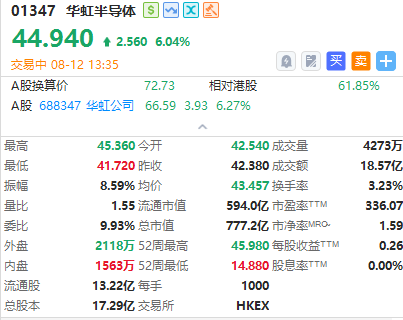 港股半导体股午后走高,宏光半导体涨超9%,华虹半导体涨超6%,晶门半导体涨超5%,中芯国际涨超4%。