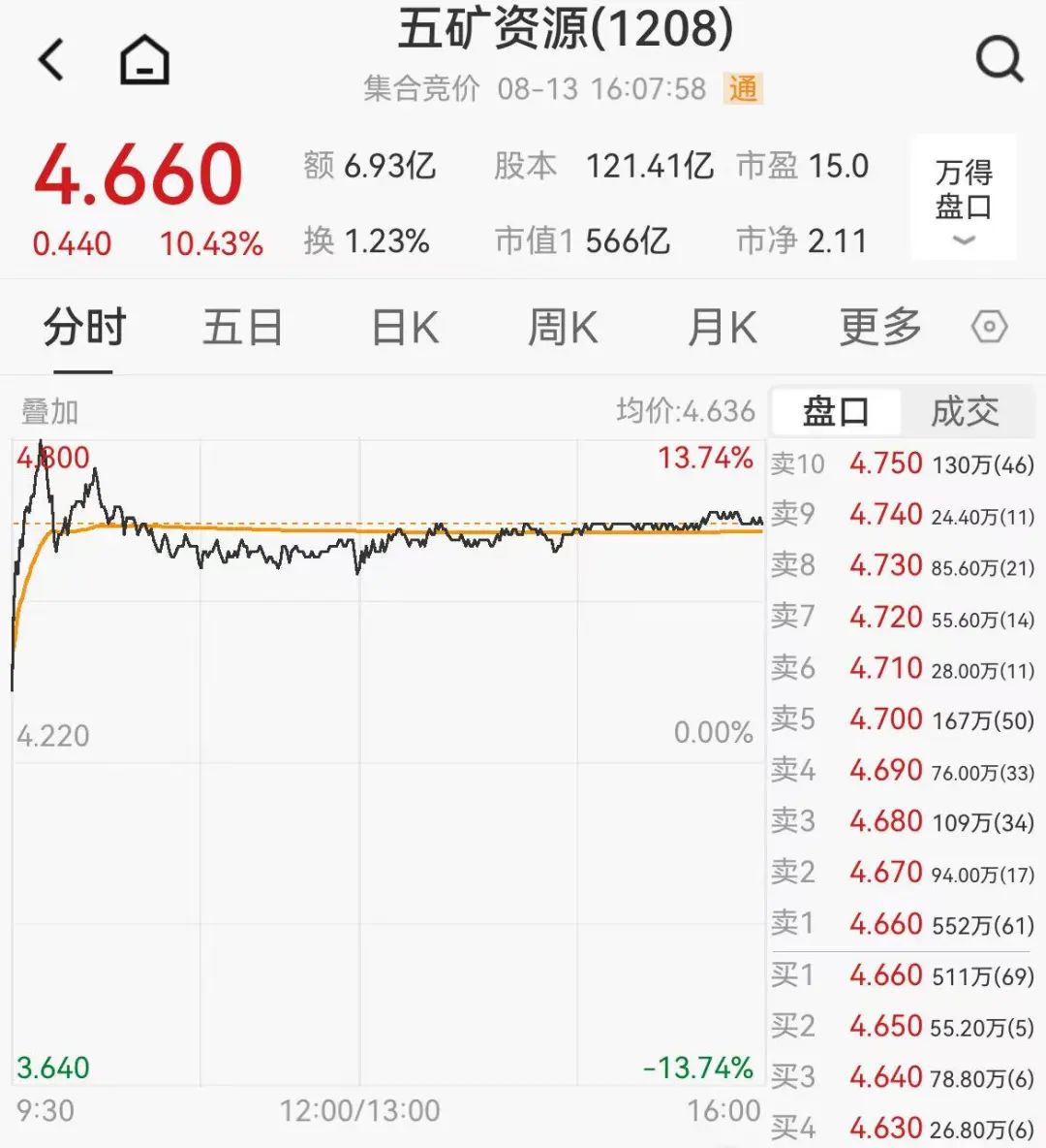 五矿资源盘中也一度上涨近14%,最高价达4.8港元。