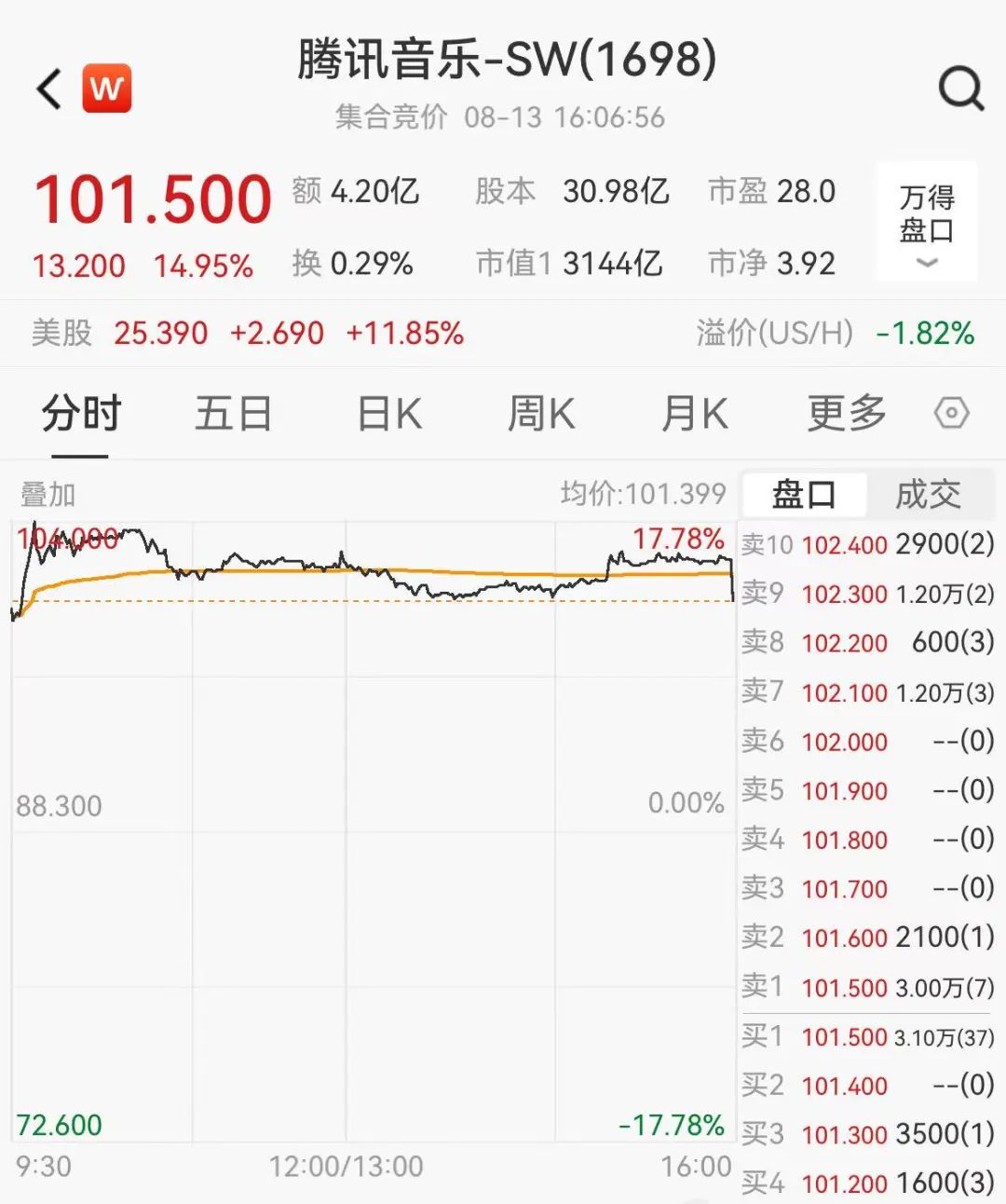 8月13日,腾讯音乐—SW、阅文集团、五矿资源等多股在中期业绩公布后,股价实现大涨。其中,腾讯音乐—SW早盘期间一度上涨至104港元,刷新上市以来新高,最大涨幅超17%。