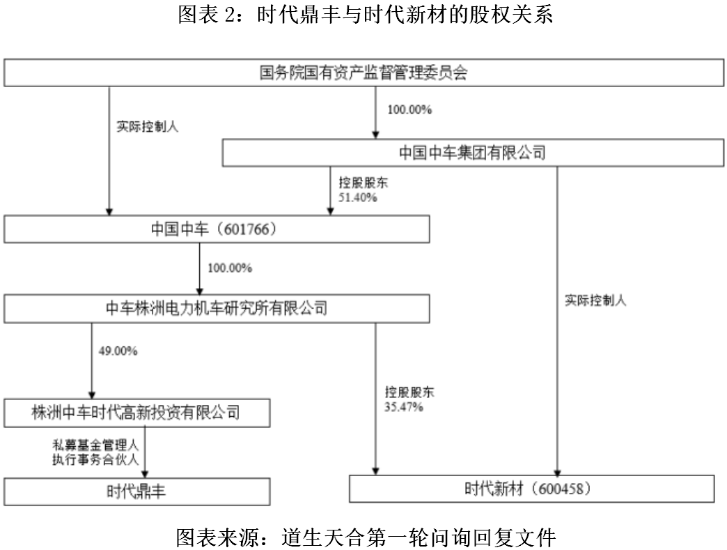 第一轮问询回复文件显示,道生天合的股东时代鼎丰与时代新材存在股权关系。