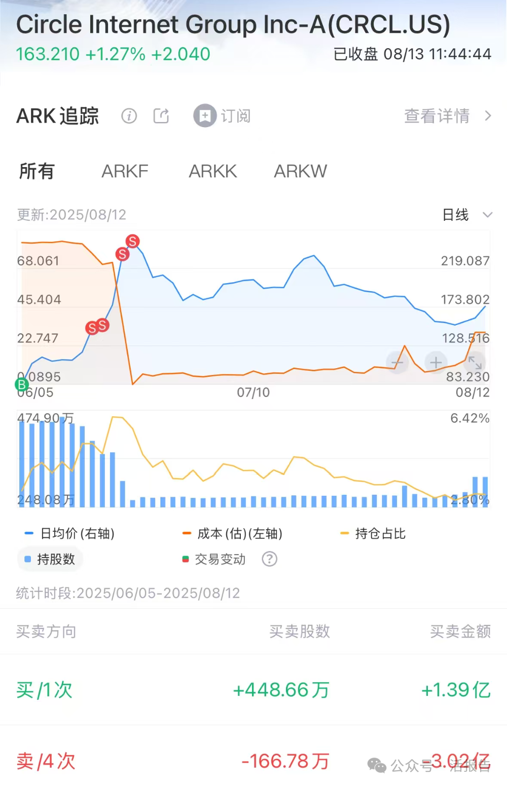 其中,“木头姐”的ARK在Circle的IPO中认购了近450万股,耗资约1.4亿美元,一举成为Circle第五大机构股东。值得注意的是,“木头姐”已经在Circle股价暴涨的时候快速套现超3亿美元,不仅已收回投资成本,剩余的持仓市值还超过5.2亿美元。